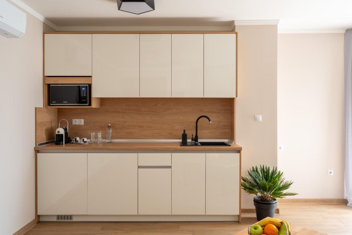 Classic One-Bedroom Apartment with King Bed. This apartment consists of 1 living room, 1 separate bedroom and 1 bathroom with a shower and free toiletries. Guests can make meals in the fully equipped kitchenette that features a refrigerator, kitchenware and a microwave. Featuring a terrace, this apartment also provides air conditioning, a coffee machine and a flat-screen TV with cable channels. The unit offers 2 beds. ;
