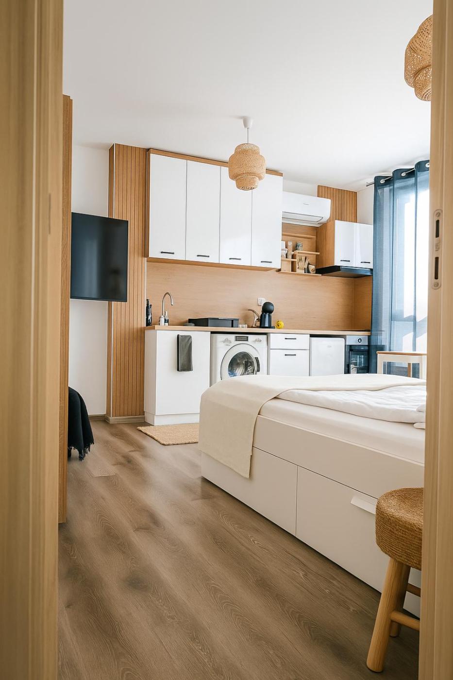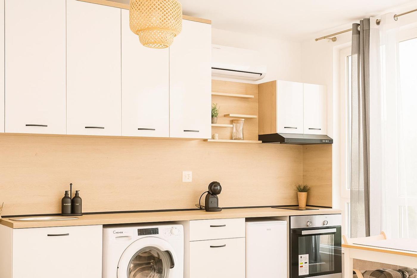 One-Bedroom Apartment. The air-conditioned apartment has 1 bedroom and 1 bathroom with a shower and a hairdryer. Meals can be prepared in the kitchenette, which has a stovetop, a refrigerator, kitchenware and an oven. Boasting a terrace with mountain views, this apartment also offers a washing machine and a flat-screen TV. The unit has 1 bed and 1 futon.